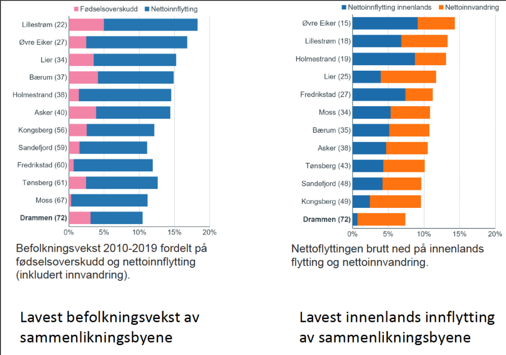 I den samme tidsperioden har befolkningsveksten vært avtakende. Telemarksforskning har i rapporten sett på flere byer Drammen kan sammenligne seg med, og av disse byene har Drammen lavest befolkningsvekst og lavest vekst i innenlands flytting.