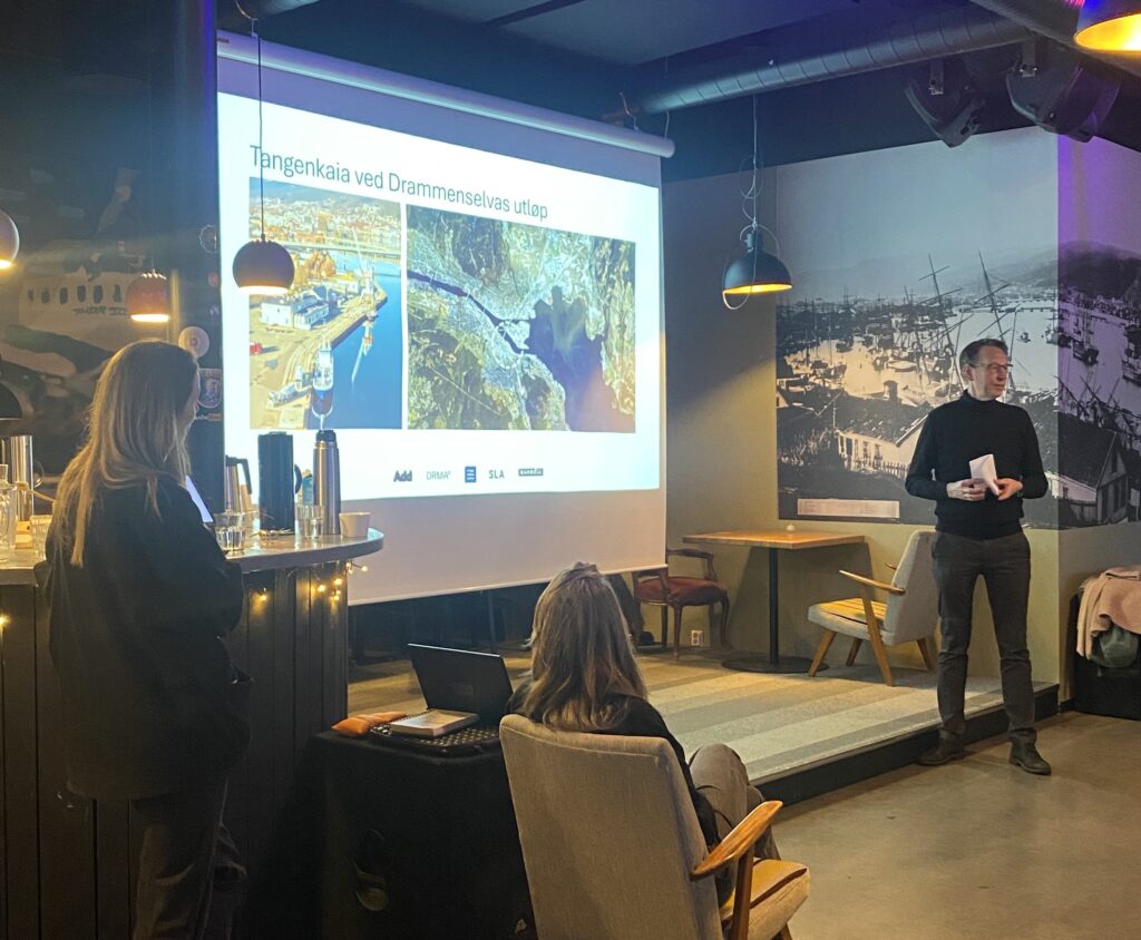 På tross av et klassisk januarvær, med sidelengs sludd og grå tåkestemning tidlig tirsdag 28. januar, fant likevel mange veien til Skur 4 på Tangenkaia. Frokostmøtet i Haandbryggeriets hyggelige lokaler ble arrangert i forbindelse med Klimafestivalen 2025 og her fikk de fremmøtte høre om hvordan vi gradvis skal forme og utvikle en ny, grønn og bærekraftig bydel i Drammen.